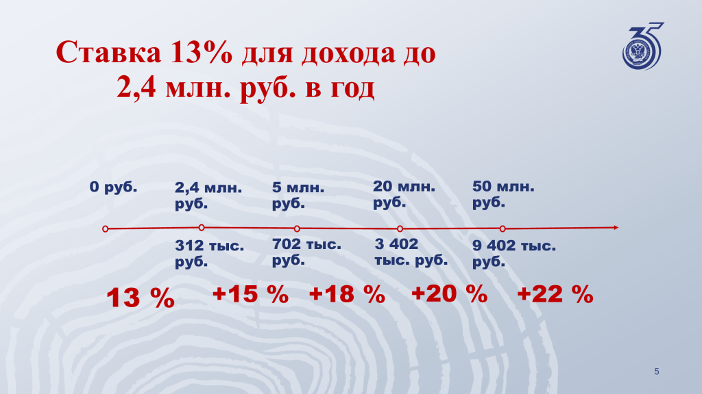 13% по доходу до 2,4 млн рублей + 15% с суммы, превышающей 2,4 млн рублей.