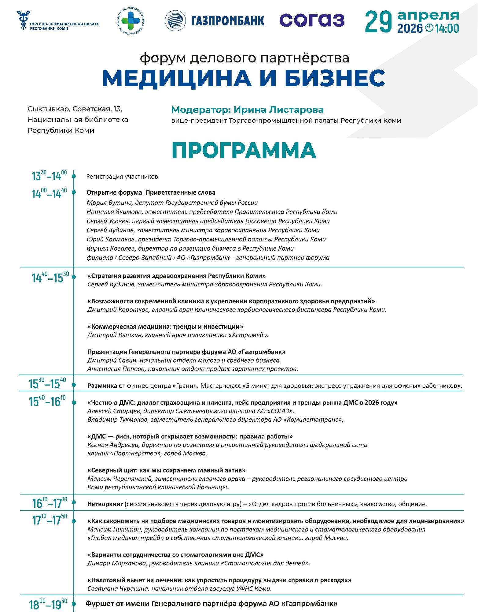 Форум делового партнёрства «Медицина и бизнес» пройдёт 29 апреля в Национальной библиотеке Республики Коми на Советской, 13. Сбор гостей с 13:30, начало форума в 14:00.