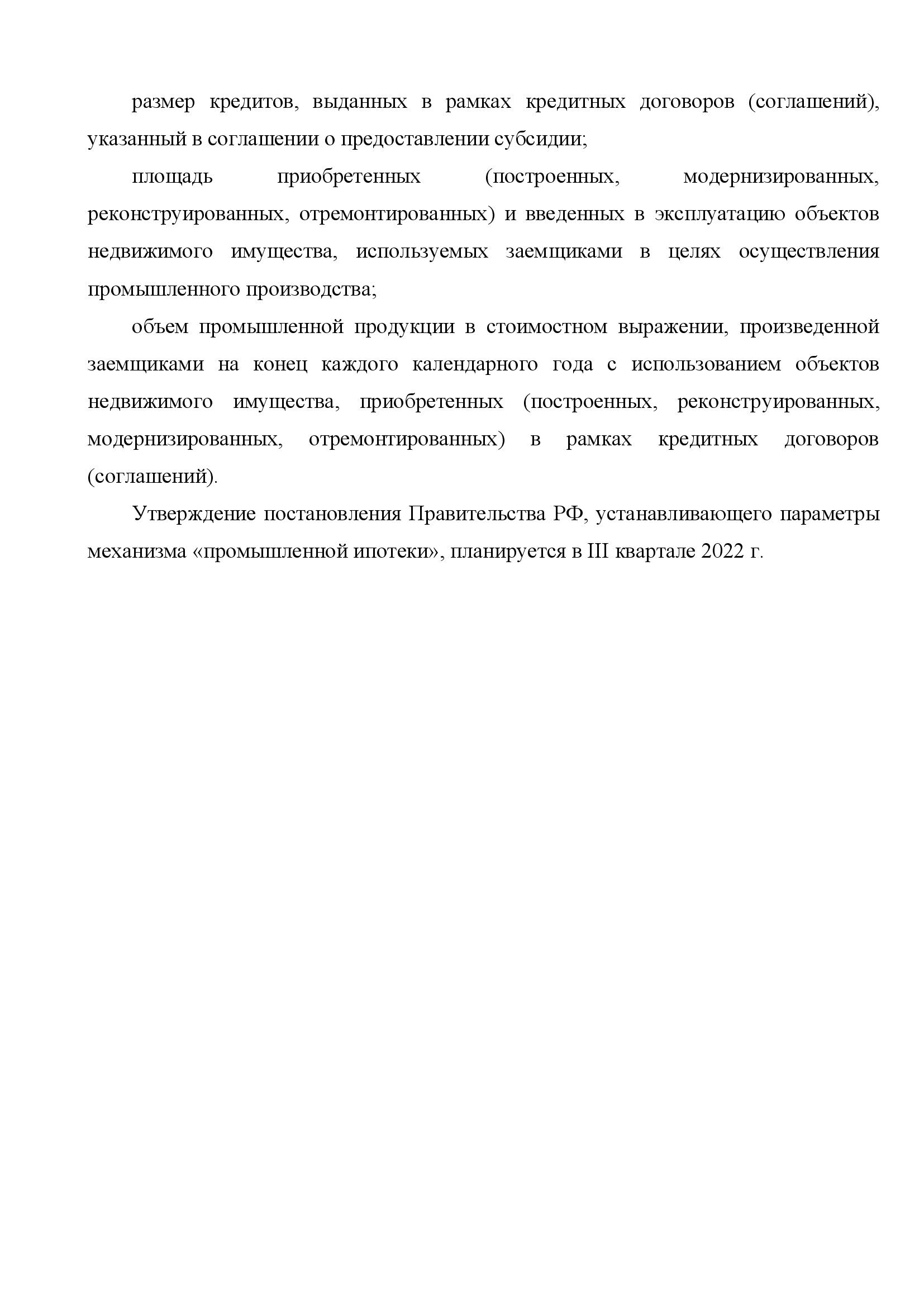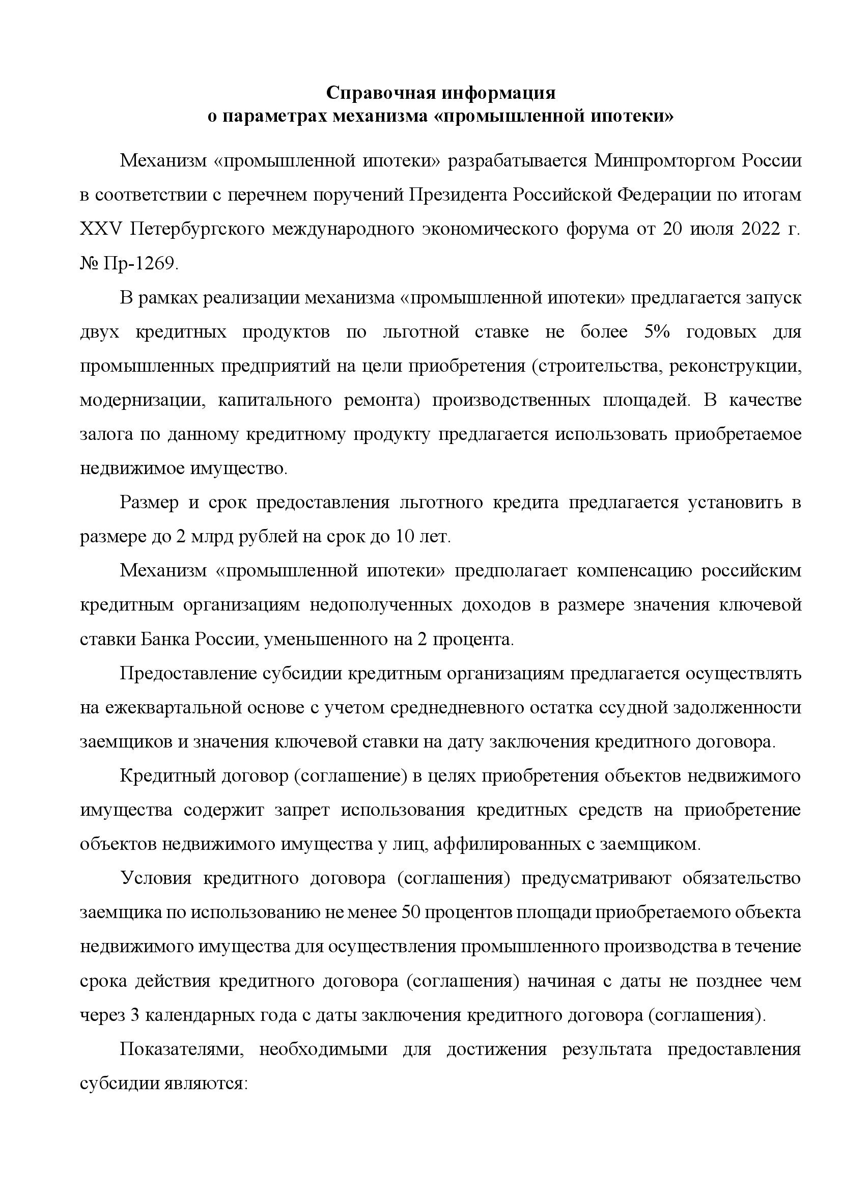 Департамент региональной промышленной политики и проектного управления Минпромторга России подготовил информационную справку по параметрам разрабатываемого механизма программы льготного кредитования "Промышленная ипотека". Программа подготовлена в соответствии с поручением Президента РФ В.В. Путина Правительству Российской Федерации и Банку России по итогам ПМЭФ-2022.