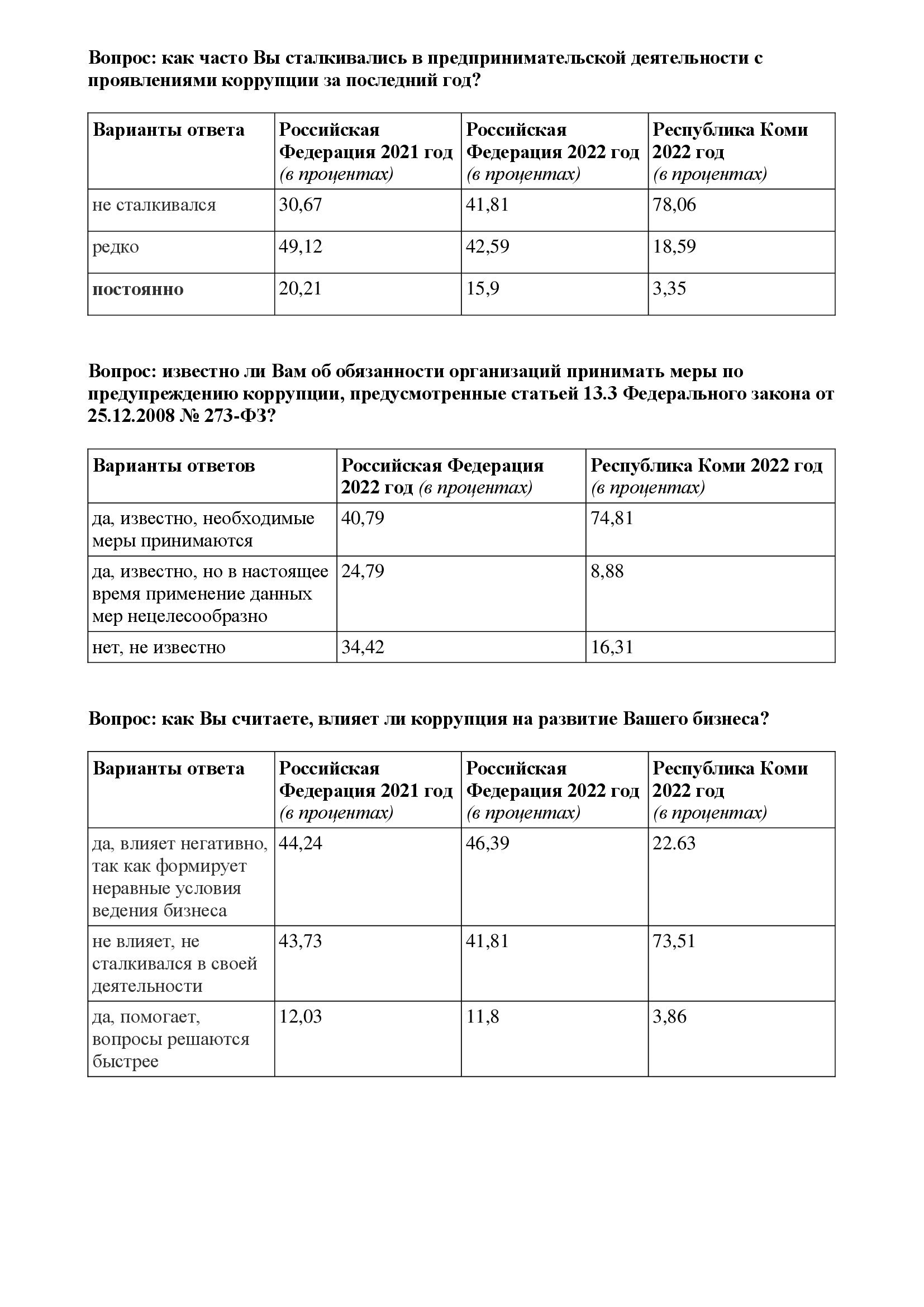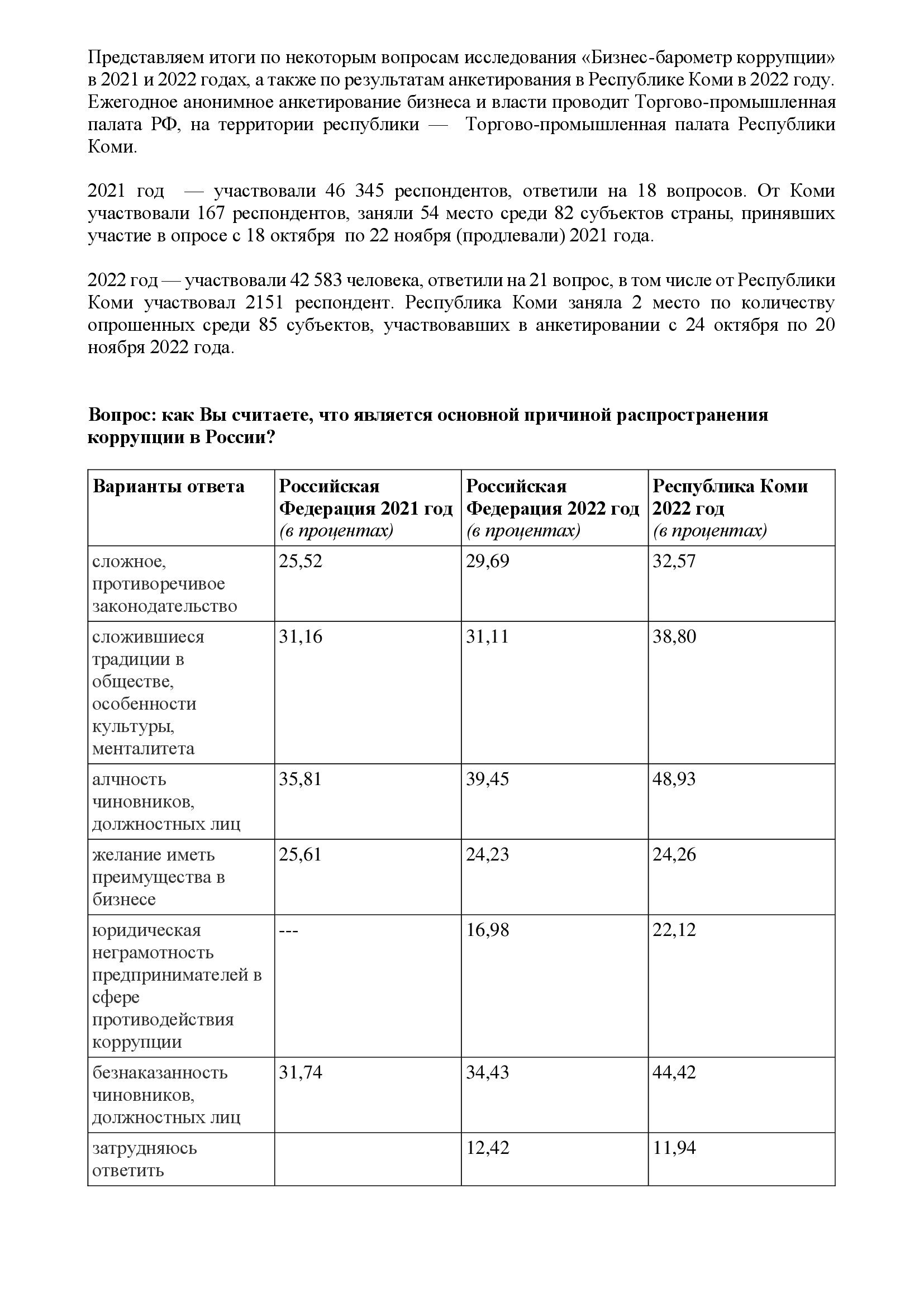 Представляем итоги по некоторым вопросам исследования «Бизнес-барометр коррупции» в 2021 и 2022 годах, а также по результатам анкетирования в Республике Коми в 2022 году. Ежегодное анонимное анкетирование бизнеса и власти проводит Торгово-промышленная палата РФ, на территории республики — Торгово-промышленная палата Республики Коми.