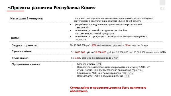 Юрий Колмаков подчеркнул, что все программы реализуются на выгодных для компаний условиях. Например, на реализацию проектов по популярной в Коми программе «Проекты развития Республика Коми» предоставляется займ от 5 миллионов до 20 миллионов рублей с 5% базовой ставкой на срок до 5 лет и с отсрочкой погашения до 3 лет. И ставка может быть снижена до 1 %, если более 50% выпускаемой предприятием продукции направляется на экспорт. Система льгот предусмотрена по всем проектам ФРП и РФРП Коми.
