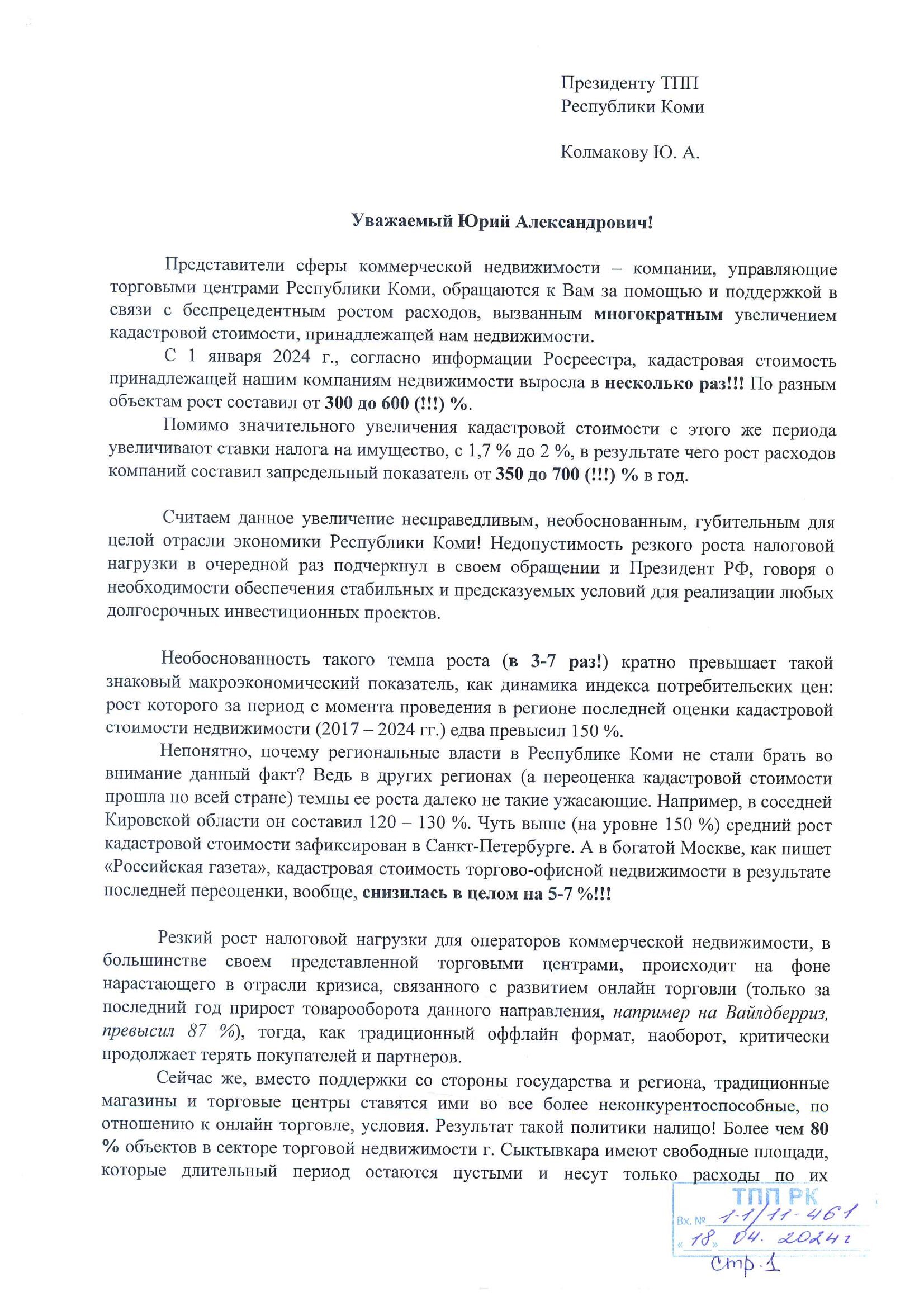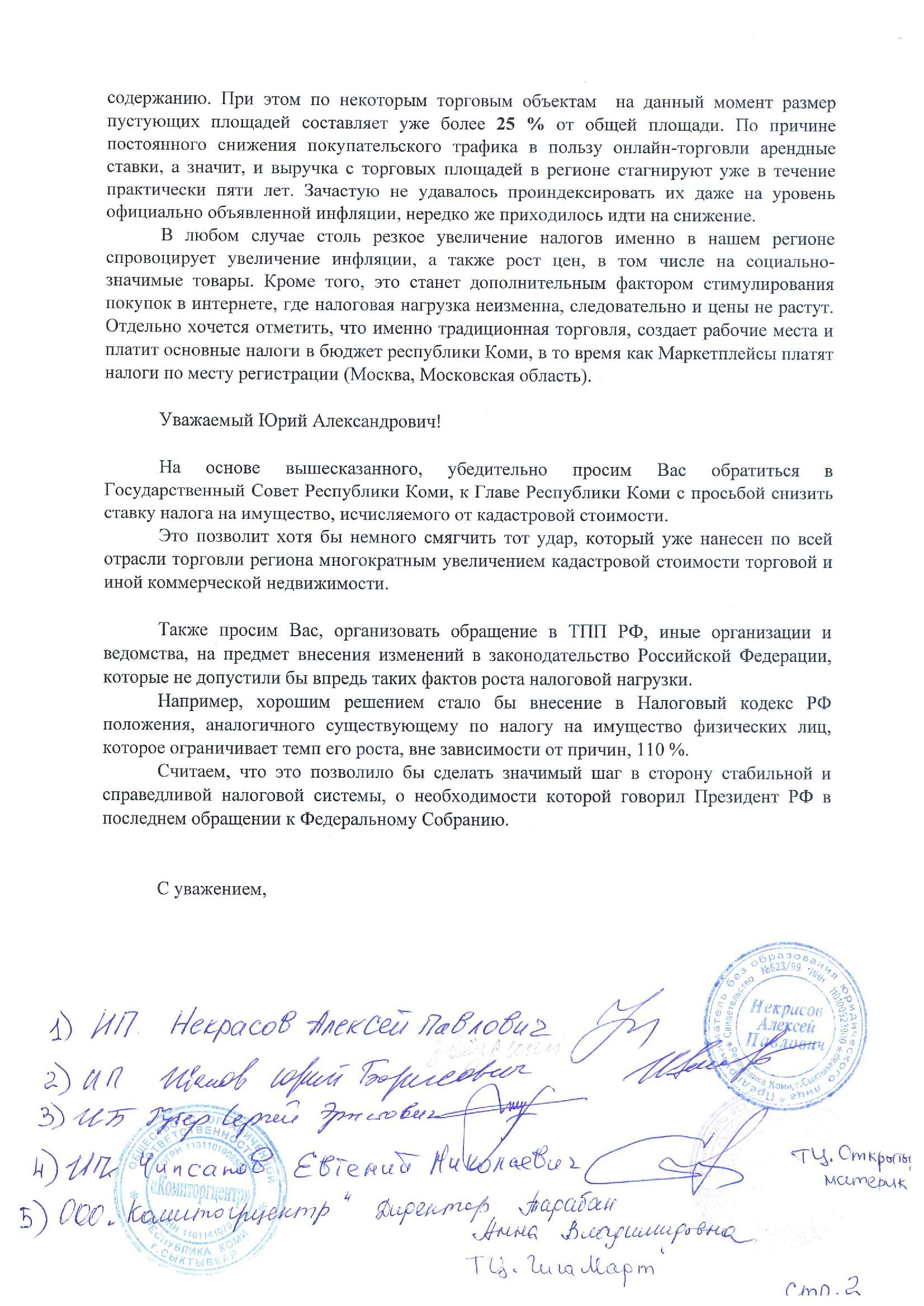 - на произошедшее в Коми увеличение размера ставки налога на имущество с 1,7 % до 2,0 % с одновременным повышением кадастровой стоимости коммерческой недвижимости.