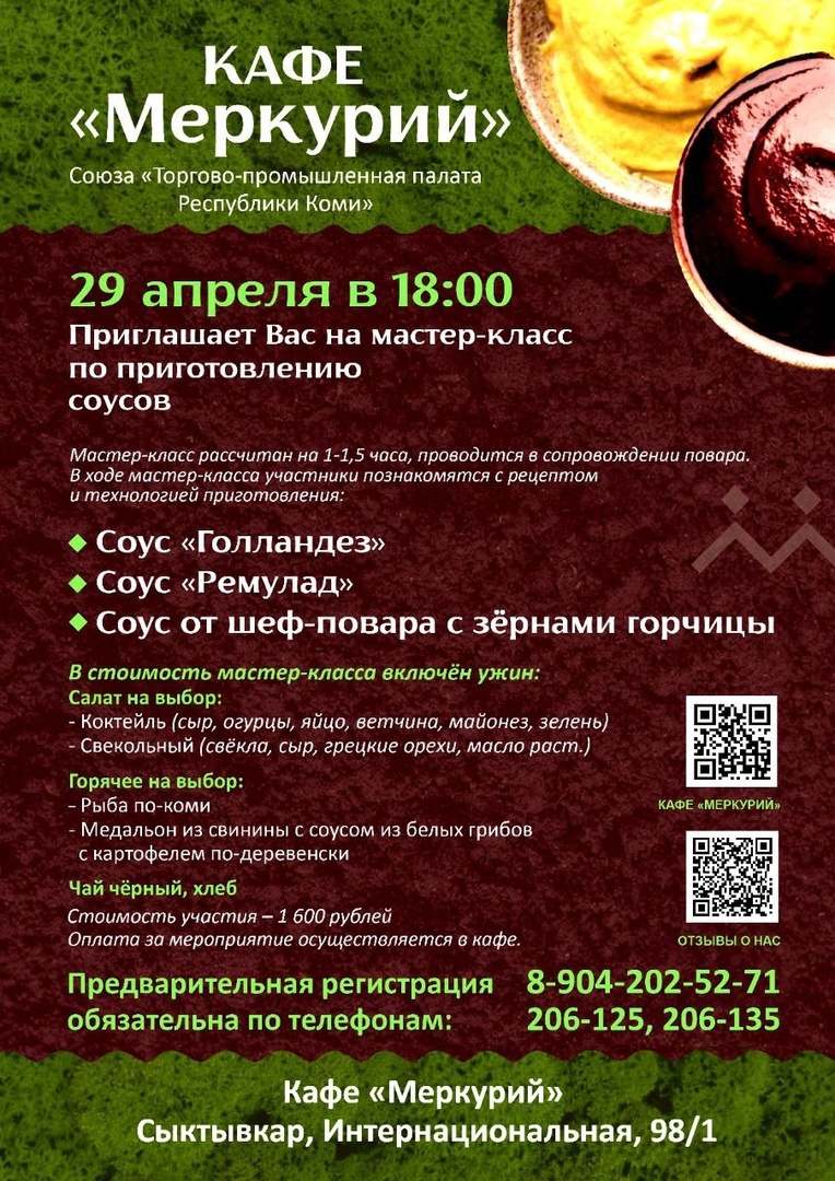 После мастер-класса гостям подадут ужин, где представят блюда на выбор: салат «Коктейль» (сыр, огурцы, яйцо, ветчина, майонез, зелень) или «Свекольный» (свекла, сыр, грецкие орехи, масло), на горячее — рыба по-коми или свинина с соусом из белых грибов и картофелем по-деревенски. Ужин включён в стоимость мастер-класса. Участие в мастер-классе обойдется в 1 600 рублей. Подробности и регистрация участников по телефонам 206-125, 206-135, 8904-202-52-71 и в группе кафе. Адрес кафе «Меркурий»: Сыктывкар, Интернациональная, 98/1.