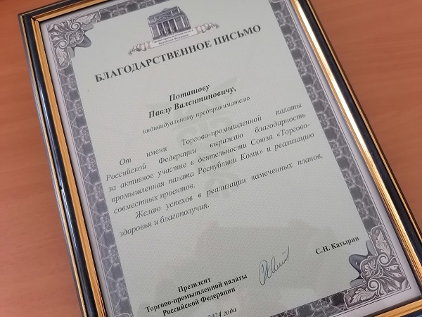 Сегодня, 24 мая, в честь 30-летия со дня основания Торгово-промышленная палата Республики Коми отмечена Благодарственным письмом Государственного Совета Республики Коми. Вручил награду руководителю ТПП Коми Юрию Колмакову председатель Комитета по бюджету, налогам и экономической политике Госсовета Коми Степан Чураков на заседании Совета Торгово-промышленной палаты Республики Коми.